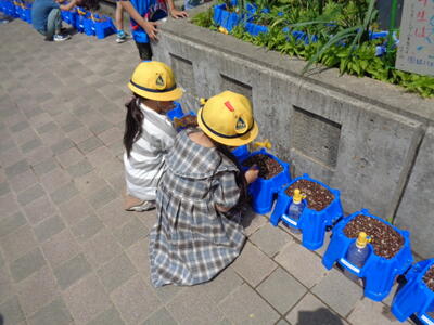 一人ひとり自分の鉢に土と元肥を入れ、あさがおの種を一粒ずつ丁寧にまきました。