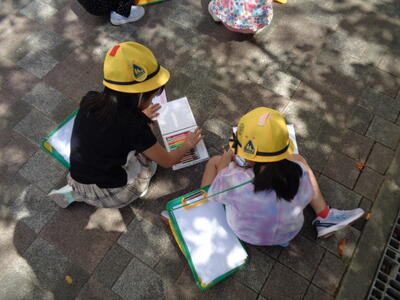 学校の中のいろいろなでこぼこを見つけて、紙にクーピーを使ってこすりました。