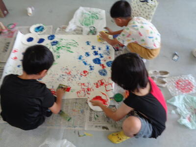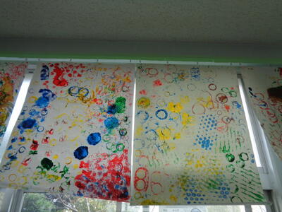 ペットボトルのキャップやラップの芯、カップなどいろいろな材料の形に絵の具をつけてうつし取りました。うつす形や色の組み合わせを工夫しながら、「どんな模様ができるかな?」とスタンプ遊びを楽しんでいました。作品の一部が、運動会のスローガンの台紙として使われることになっています。